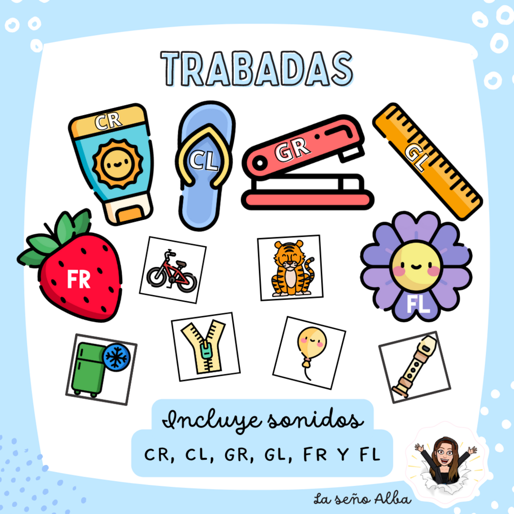 Hoy os traigo un material muy sencillo para trabajar las trabadas. Consiste en clasificar los diferentes cuadraditos de dibujos con su trabada. Por ejemplo, si encontramos el dibujo "cremallera" tendremos que ponerlo encima de la trabada "CR" (que, además, viene con su dibujo de CRema)