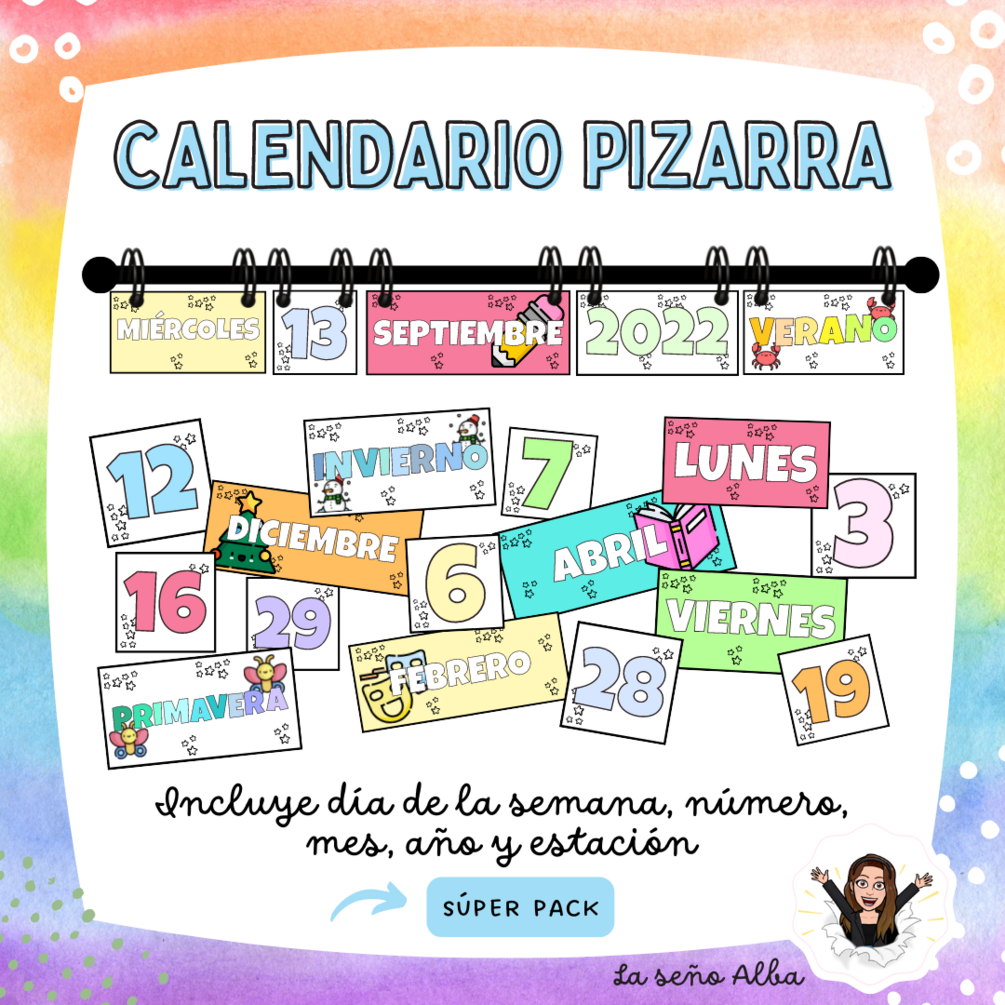 Contiene día de la semana, número, mes, año y estación, siguiendo la temática colorida de anteriores materiales 🌈